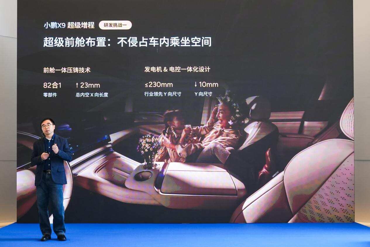 在聯(lián)合研發(fā)攻堅(jiān)戰(zhàn)中,首先要面對的是挑戰(zhàn)布置空間,小鵬X9超級(jí)增程如何實(shí)現(xiàn)行業(yè)最高集成度,不侵占座艙空間?小鵬X9超級(jí)增程前艙布局緊湊,在不壓縮座艙乘坐空間的前提下,小鵬汽車與華為選擇通過發(fā)電機(jī)與電控的高集成度設(shè)計(jì),將發(fā)電機(jī)Y向尺寸極致壓縮至≤230mm。結(jié)合小鵬汽車的前艙一體壓鑄技術(shù),實(shí)現(xiàn)零部件82合?,總內(nèi)空X向?度提升23mm,共同實(shí)現(xiàn)了前艙空間利用率的行業(yè)突破。
