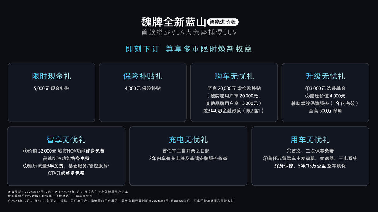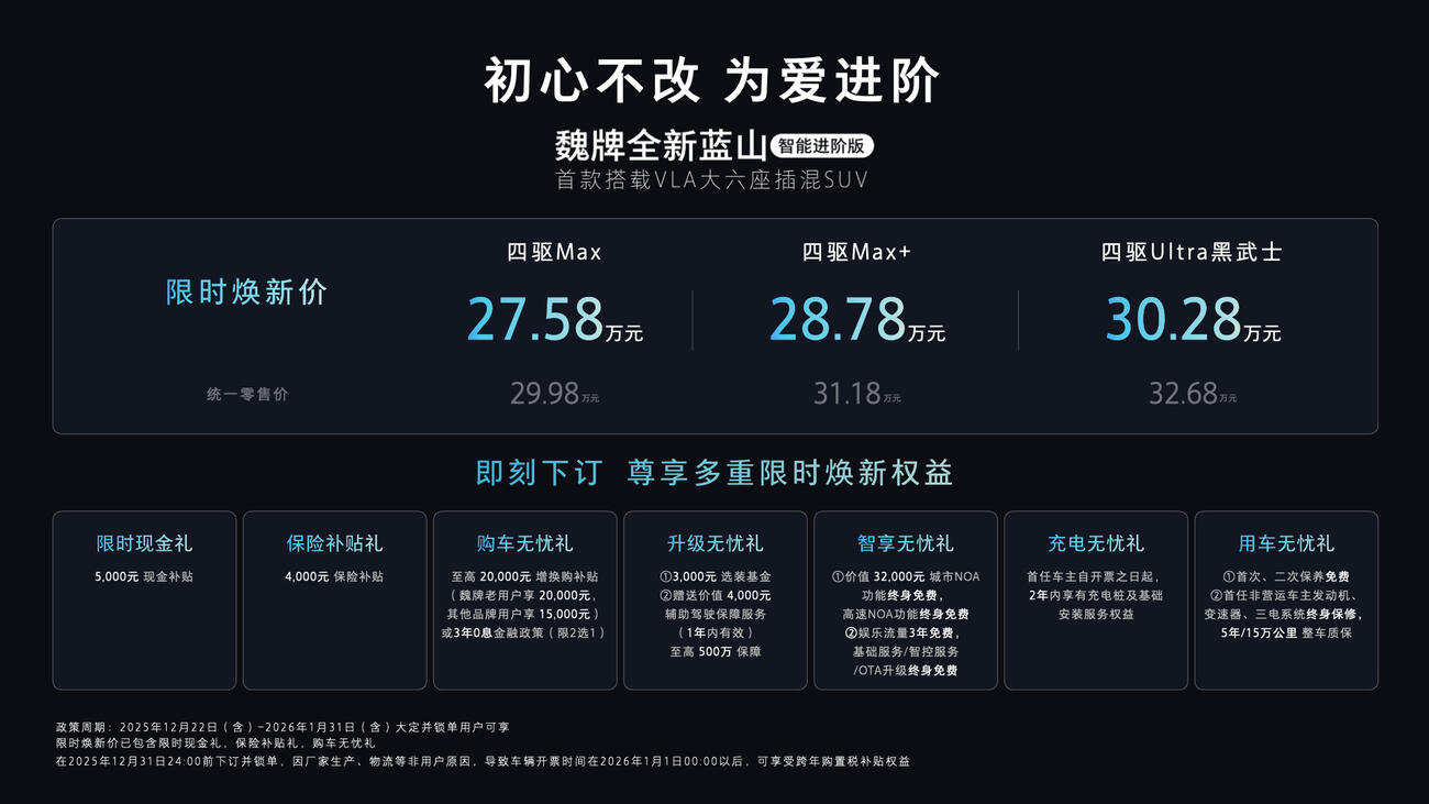 為讓更多用戶輕松擁有“為愛進階”的出行體驗,魏牌全新藍山智能進階版同步推出誠意十足的購車權(quán)益: